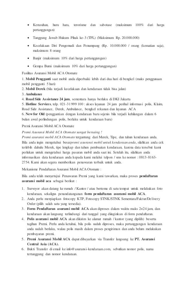 Asuransi mobil All Risk mengcover semua kerugian yang timbul akibat kecelakaan. Ditetapkannya peraturan Otoritas Jasa Keuangan ( OJK ) yang efektif berlaku per 1 Maret 2014 yang paling merasakan dampak kenaikan premi yang signifikan adalah mobil dengan katagori harga di bawah Rp. 200.000.000 ,- ( Dua ratus juta rupiah ). Ini Aturan Premi Asuransi Mobil All Risk ACA dan Simulasi Terbaru. 22 Juli 2021. AsuransiMapan.com Aturan Premi Asuransi Mobil All Risk ACA - PT Asuransi Central Asia atau ACA, merupakan salah satu perusahaan asuransi yang sudah ada sejak 1956. Hingga saat ini sudah tersebar 42 kantor cabang dan 23 perwakilan di berbagai kota besar di Indonesia. Asuransi Mobil All Risk Terbaik. ACA Otomate adalah asuransi mobil all risk terbaik dengan fasilitas mobil pengganti bila mobil Anda tabrakan dan harus masuk bengkel. Kalau ada mobil pengganti, gak ada cerita batal bepergian. (tersedia di Jakarta, Bogor, Depok, Tangerang, Bekasi, Bandung & Semarang) Asuransi motor adalah asuransi yang memberikan manfaat perlindungan bagi motor kesayangan Anda agar Anda dapat menghindari risiko kerugian finansial jika hal-hal yang tidak diinginkan seperti kehilangan atau kecelakaan terjadi, sehingga Anda dapat berkendara dengan aman dan nyaman. Hubungi kami untuk keterangan lebih lanjut serta pendaftaran.
