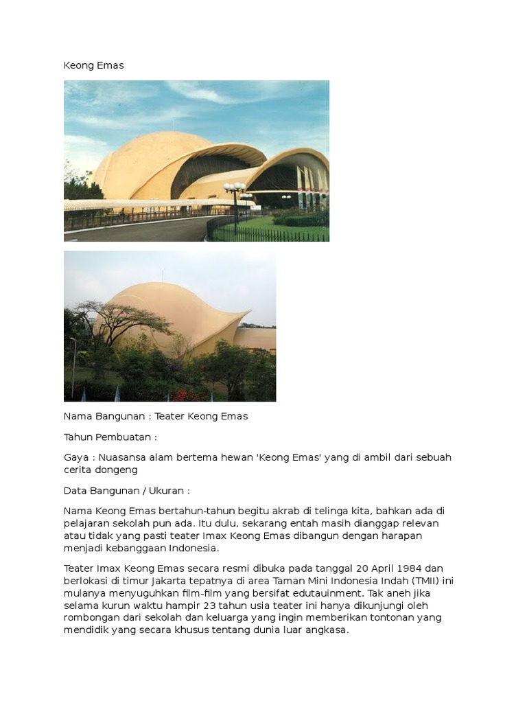 TEATER IMAX KEONG MAS, TMII JAKARTA Teater Imax Keong Emas didirikan atas prakarsa Almarhumah Hj. lbu Tien Soeharto, dan mulai dioperasikan pada tanggal 20 April 1984 yang dimaksudkan sebagai sarana rekreasi yang mendidik guna memperkenalkan kekayaan alam dan budaya bangsa melalui tayangan film (audio-visual) layar raksasa dengan menggunakan kecanggihan … English: Keong Emas (Golden Snail), an IMAX theater located in Taman Mini Indonesia Indah. Bahasa Indonesia: Teater Keong Emas, Taman Mini Indonesia Indah. 20/10/2018 · Gambar 3.10 Sketsa Denah Teater IMAX Keong Emas 22. 22 3. Bentuk Bangunan Karena lengkungan merupakan pertimbangan desain dasar, struktur permukaan dengan lengkungan tunggal ini tidak betul-betul dipertimbangkan sebagai shell, karena respon structural dasar mereka bukan merupakan aksi tipe membrane. Mereka ...