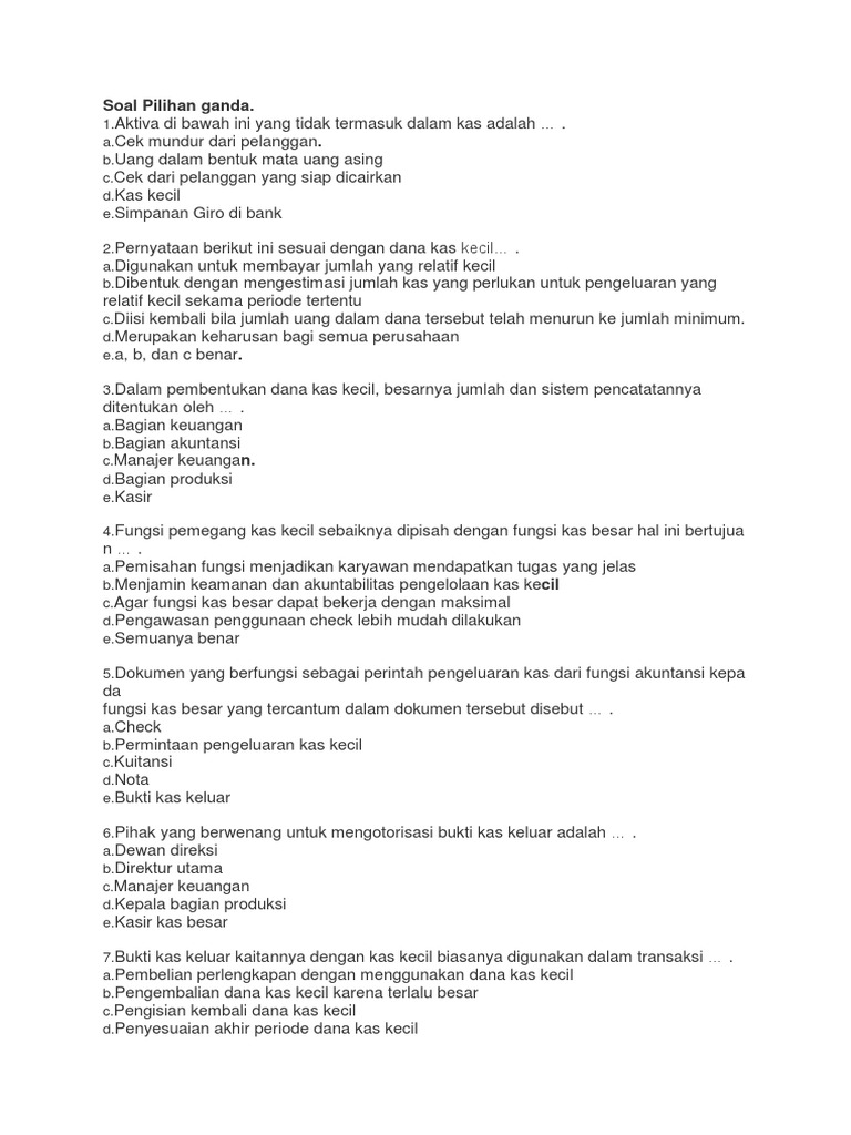 Kas Paguyuban dipegang oleh Bendahara dan disetorkan ke Bank dalam rekening khusus dana pengelolaan lingkungan yang tidak tercampur dengan dana lainnya. Setiap Pengeluaran dana dari Kas Paguyuban Perumahan Bojonggede Green Park RT 002/RW 003 harus atas persetujuan dari Ketua. 4. Ia menyampaikan hal itu pada pelepasan pelepasan kas keliling wholesale ke pulau Terdepan, Terluar dan Terpencil (3T) yang merupakan kerja sama antara BI dengan TNI Angkatan Laut di Dermaga Pelabuhan Teluk Bayur Padang. Menurut Marlison, peredaran rupiah bukan hanya sebatas alat tukar namun juga menjaga kedaulatan NKRI. Simpanan dalam bentuk giro di bankCheck ; surat perintah membayar yang dibuat ... Dibentuk dana kas kecil untuk membayar pengeluaran kecil dan rutin yang ... Lulusan di Program Akuntansi dan Keuangan : 1. Pengembangan diri dengan melanjutkan pendidikan ke jenjang Perguruan Tinggi. 2. Penyaluran Tenaga Kerja. Banyak siswa siswi akuntansi yang lulus langsung bekerja di perusahaan perushaan ternama melalui Bursa Kerja Khusus (BKK) SMK Negeri 1 Kebumen.