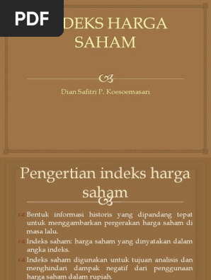 Pengertian indeks harga saham gabungan. Metode Perhitungan Indeks Harga Saham Gabungan. Berikut ini merupakan beberapa metode untuk melakukan perhitungan indeks harga saham. 1. Cara Tertimbang (Sederhana) Indeks tertimbang adalah indeks yang mempertimbangkan berbagai faktor yang akan mempengaruhi naik turunnya angka indeks tersebut. Pengertian Indeks Harga Saham Gabungan (IHSG) memang harus dipahami dengan baik untuk mengetahui tabungan saham perusahaan. Dapat diartikan bahwa Indeks Harga Saham Gabungan merupakan jumlah nilai gabungan dari berbagai saham perusahaan yang telah tercatat pada Bursa Efek Indonesia, yang mana pergerakannya mengindikasikan situasi di pasar modal. 9 Jan 2021 — Karyawan mengabadikan layar Indeks Harga Saham Gabungan (IHSG) di Bursa Efek Indonesia, Jakarta, Jumat (8/1/2021). A. Pengertian IHSG (Indeks Harga Saham Gabungan) IHSG (Indeks Harga Saham Gabungan) atau Indonesia Composite Index (ICI), dan ada juga yang menyebutnya dengan IDX Composite adalah salah satu indeks pasar saham yang digunakan oleh Bursa Efek Indonesia (pada saat itu Bursa Efek Jakarta atau BEJ). Diperkenalkan pertama kali pada tanggal 1 April 1983 sebagai indikator pergerakan saham di BEJ. IHSG ...