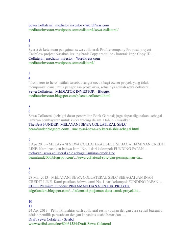 FUNDER INDONESIA (BANK GARANSI. MT760.MT799) Sunday, February 10, 2013 ... (macam-macam Proyek Investasi &/ pinjaman Loan Creditline) : o Kerjasama Proyek : GAS, OLI &/energy. ... Fasilitator dan pemohon membuat perjanjian kerjasama. 7. Pemohon membayar booking fee USD/Euro 2.500 (dua ribu lima ratus)/ KONDISIONAL. ...