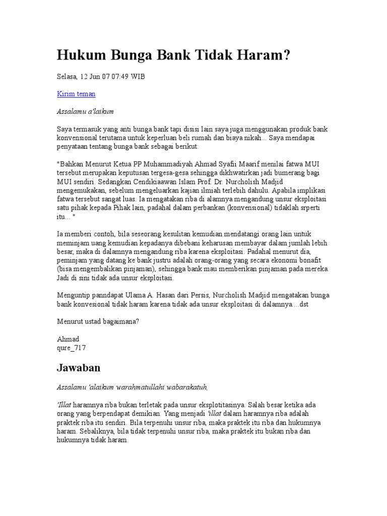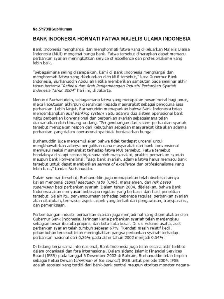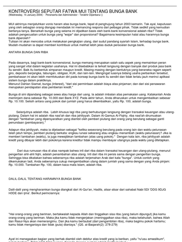 MUI sebagai lembaga tertinggi yang memayungi seluruh umat Islam di Indonesia mengeluarkan sebuah fatwa tentang pengharaman bunga bank. Fatwa tersebut pada 16 Desember 2003 lalu. Fatwa MUI bahwa bunga bank itu haram menunjuk pada ayat-ayat al-Quran khususnya Qs. An-Nisa 19, An-Nisa 160-161, Ar-Rum 39, Ali Imron 130, dan Al Baqoroh 278-279.