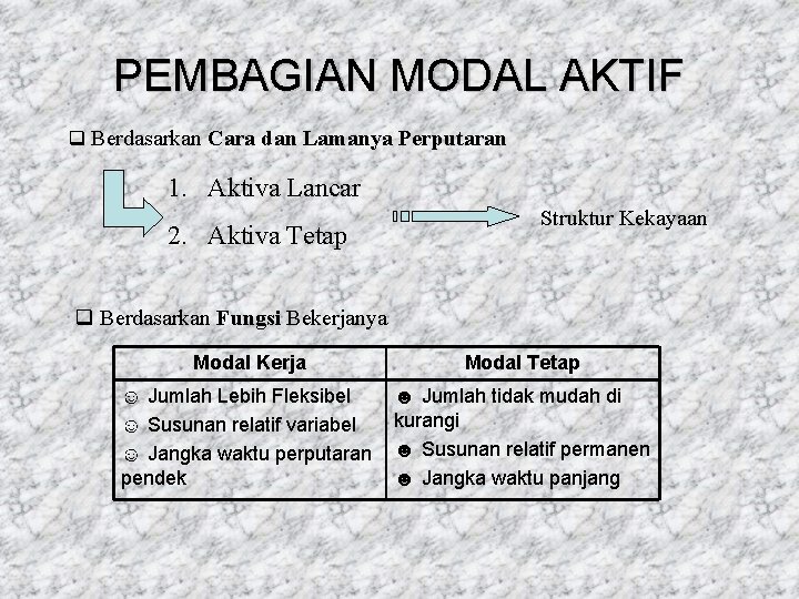 Beda Kredit Aktif dan Pasif Dalam Perbankan. 20 Desember 2021. 2 minute read. Kelas Pintar. Istilah “kredit” mungkin sudah tidak asing lagi ditelinga kita, apalagi bagi masyarakat yang kehidupannya berdekatan dengan layanan jasa perbankan. Pada dasarnya “kredit” dinilai sebagai sarana simpan pinjam yang cukup membantu perekonomian. Kredit pasif merupakan aliran dan a dari masyarakat yang masuk ke bank, sedan gkan kredit aktif ialah dan a yang digunakan masyarakat untuk kegiatan produktif. Sekarang kita bahas satu per satu ya. Baca Juga: Pengertian Fungsi, Jenis, dan Syarat Uang Produk Perbankan Kredit Pasif 1. Simpanan/Tabungan May 19, 2017 · Pelajar akan sentiasa aktif dan yakin berkomunikasi jika guru sentiasa memberi kepada mereka untuk bercakap. Manakala guru yang tidak memberi peluang untuk pelajar bercakap akan membuat pelajar mereka pasif . Oleh itu, pelajar abad ke-21 perlulah diberi peluang oleh guru untuk lebih berkomunikasi di dalam kelas. ... Sistem kredit ini adalah ...
