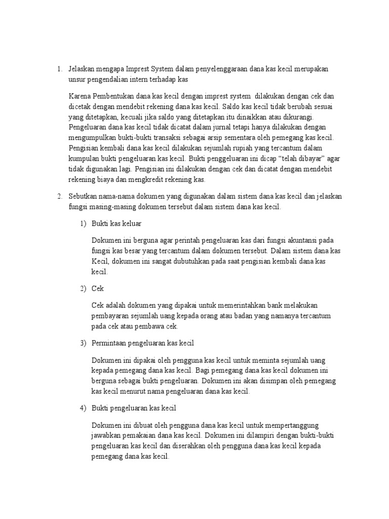 Pemegang dana kas kecil hanya mengarsipkan dokumen permintaan pengeluaran kas kecil. Sebutkan prosedur pada bagian pemegang dana kas kecil. Kas dapat terdiri dari kas kecil atau dana dana kas lainnya seperti penerimaan uang tunai dan cek cek yang bukan mundur untuk disetor ke bank keesokan harinya. Sebaliknya jika jumlah kas rp 10000000 ...