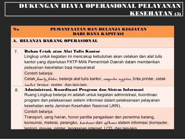 Dana Kapitasi dari BPJS kesehatan yang dapat dipergunakan untuk kunjungan prolanis, kegiatan Puskesmas prolanis dan kunjungan rumah. Kesimpulannya, langkah yang perlu dilakukan adalah mengimplementasikan pemberian kompensasi berdasarkan regulasi, memberikan pedoman teknis dan menjelaskan kriteria daerah penerima serta mekanismenya dan mencari ...