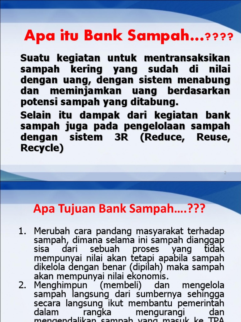 PDF Buku panduan sistem bank sampah 10 kisah sukses ina Program bank sampah merupakan suatu sistem pengelolaan sampah secara kolektif dengan prinsip daur ulang. Metode ini bisa meningkatkan nilai ekonomis dari sampah kering. Sementara masyarakat yang bertindak sebagai nasabah bank juga akan mendapat keuntungan. Mereka bisa punya tabungan yang bisa diambil sesuai kebutuhan.