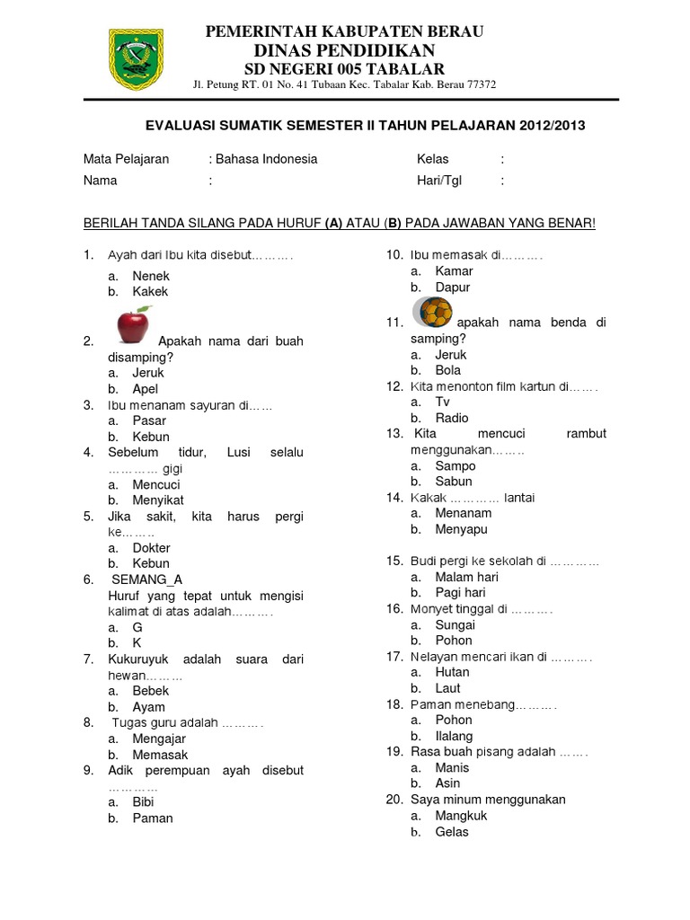 Contoh Soal Bahasa Indonesia Kelas 2 SD Semester 1 Dan 2 Contoh Soal Bahasa Indonesia Kelas 2 SD Semester 1 Dan 2. Di bawah ini terdapat beberapa soal latihan untuk anak, yang dapat dijadikan sebagai bahan latihan, untuk membantu daya fikir anak agar dapat terbiasa menghadapi berbagai soal pelajaran yang di berikan dari sekolah, berikut contohnya: 2. Ayahku saat ini sedang berada di jakarta.