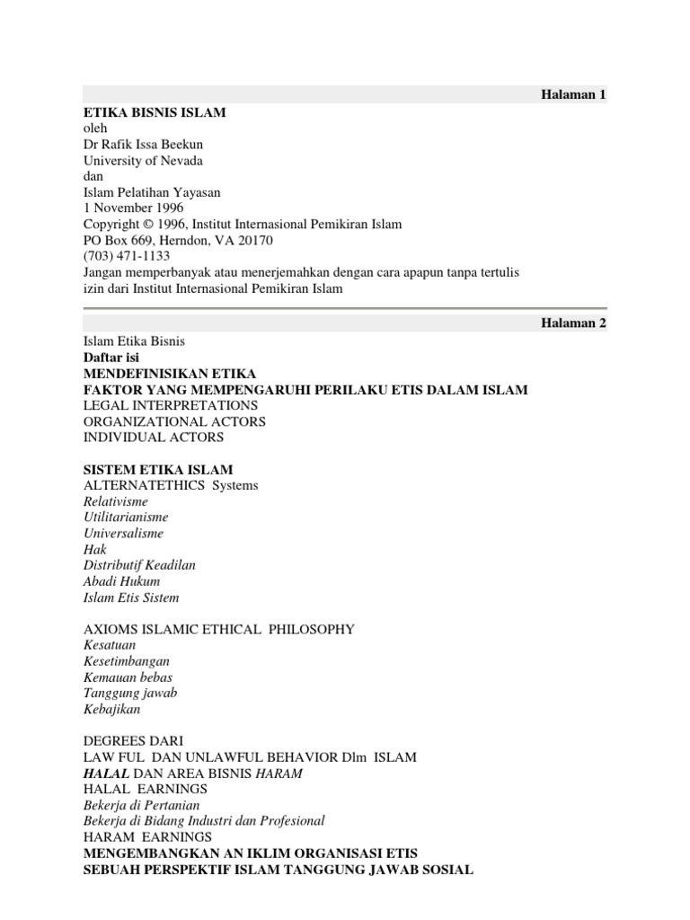 Pada umumnya dalam dunia bisnis tujuan utama adalah ingin mencari keuntungan tanpa batas (unlimited profit) berupa materi. Maka apa yang hendak dicapai adalah ";menghalalkan" segala daya dan upaya agar maksud dan tujuan tercapai. Buku Etika Bisnis Islam| Kata bisnis dalam Al Qur’an yang berarti al-tijarah, berasal dari kata ... Etika Bisnis Islam. Sebagian banyak umat Islam masih belum mengetahui aturan-aturan bisnis dalam Islam. Sehingga tidak sedikit dari kita yang tidak sengaja melanggar aturan-aturan yang dilarang seputar bisnis. Kemudian, Islam sebagai agama yang lengkap tidak hanya mengeluarkan aturan-aturan dasar yang penting tentang haram atau tidaknya ...