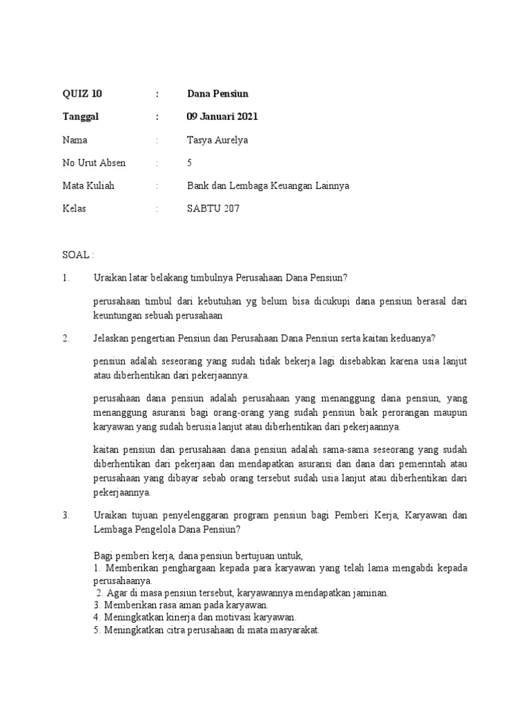 Contoh Soal Tentang Lembaga Keuangan Bukan Bank ... - Muttaqin 33. Dana pensiun didapat dari ... pegawai elama dia bekerja. a. Hutang b. Honor c. Jatah d. Iuran 34. Jangka waktu asuransi dwiguna bisa di ambil selama ... tahun a. 25 b. 5 c. 1 d. 20 35. Asuransi dwiguna memiliki ... manfaat a. 4 b. 2 c. 1 d. 3 36. Di bawah ini yang bukan termasuk asuransi sosial yaitu ... a. Jiwa b. Kebakaran c. Beasiswa d ...