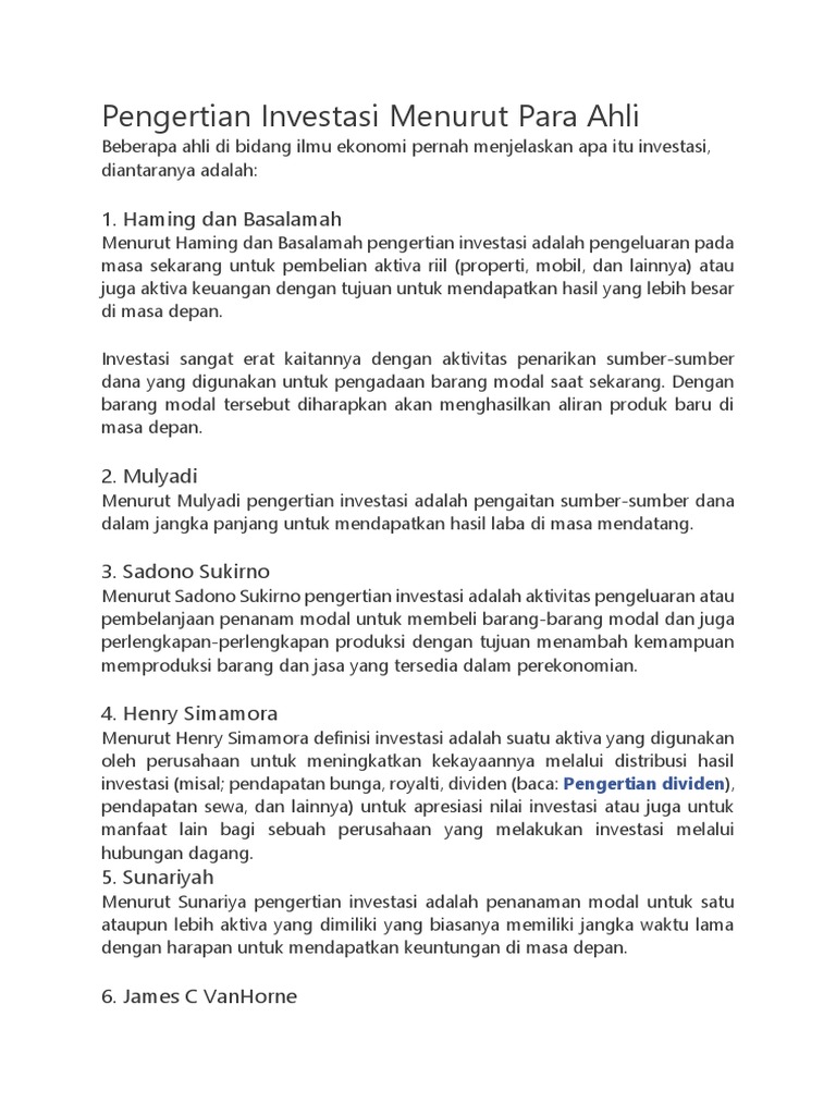 Pengertian Investasi: Menurut Para Ahli, Jenis, Manfaat ... Menurut para ahli investasi memiliki definisi bermacam-macam diantaranya: Menurut Mulyadi. Mulyadi mendefinisikan investasi sebagai hubungan keterikatan antara sumber-sumber dalam suatu periode dengan jangka waktu yang panjang untuk memperoleh keuntungan di masa selanjutnya. Menurut Sadono Sukirno.