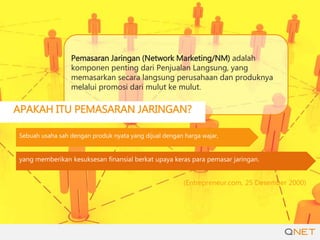 Waspada! Inilah Cara Kerja Bisnis MLM Qnet Cari Mangsa ... Sesuai pengakuan korban, mereka diiming-imingi keuntungan besar yang dijalankan oleh PT Qnet. Diawali dari para korban menyetor uang tunia senilat Rp10 juta....