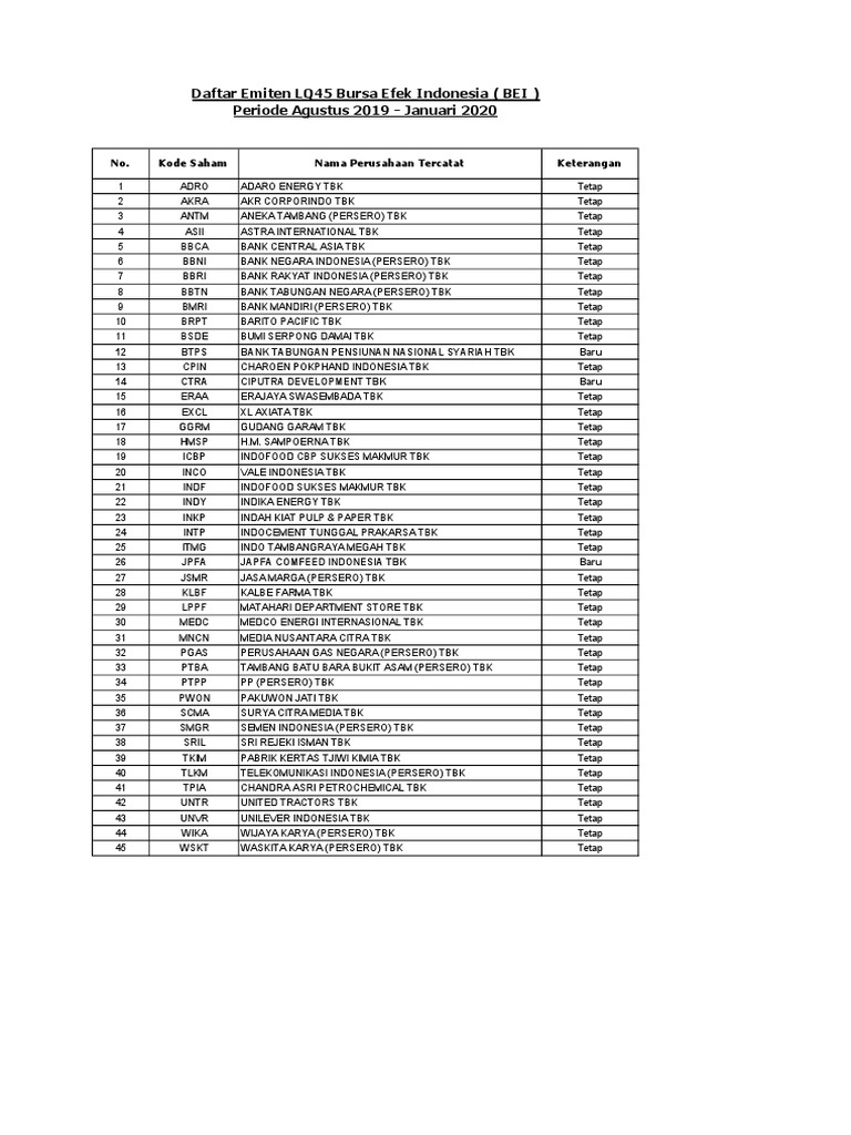 Indeks LQ45: Pengertian, Kriteria dan Daftar Sahamnya ... Artinya, indeks LQ45 memuat daftar 45 emiten terlikuid dengan kondisi fundamental perusahaan yang baik. Kriteria Saham LQ45. Penentuan saham yang masuk dalam daftar LQ45 dilakukan melalui penilaian tertentu. Berikut ini merupakan beberapa kriteria untuk menilai suatu emiten masuk ke dalam LQ45: Telah tercatat di BEI selama minimal 3 (tiga) bulan Big Alpha - Daftar Indeks LQ45 Terbaru, Saham Paling ... Berikut adalah daftar saham LQ45 periode Agustus 2021 sampai Januari 2022: 1. ACES - Ace Hardware Indonesia Tbk 2. ADRO - Adaro Energy Tbk 3. AKRA - AKR Corporindo Tbk 4. ANTM - Aneka Tambang Tbk 5. ASII - Astra International Tbk 6. BBCA - Bank Central Asia Tbk 7. BBNI - Bank Negara Indonesia (Persero) Tbk 8. Indeks LQ45 - PT. Kontan Grahanusa Mediatama Daftar saham anggota Indeks LQ45. No. Kode Nama Saham Keterangan; 1: ADRO: Adaro Energy Tbk. Tetap: 2: AMRT: Sumber Alfaria Trijaya Tbk.