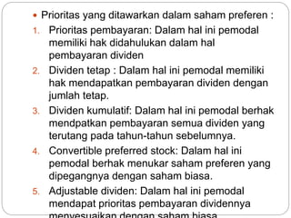 Saham Biasa dan Saham Preferen Saham adalah satuan nilai atau pembukuan dalam berbagai instrumen finansial yang mengacu pada bagian kepemilikan sebuah perusahaan. Dengan menerbitkan saham, memungkinkan perusahaan-perusahaan yang membutuhkan pendanaan jangka panjang untuk 'menjual' kepentingan dalam bisnis... Perbedaan Saham Preferen (Preferred Stock) dengan Saham Biasa... Jadi dapat disimpulkan perbedaan antara saham preferen dengan saham biasa: Pada saham biasa mendapatkan hak untuk memilih direksi dan kebijakan tertentu, sedangkan preferen tidak (kecuali dalam situasi tertentu). Deviden pada saham biasa tergantung kinerja perusahaan... Saham Preferen: Arti, Contoh, dan Bedanya dengan Saham Biasa Saham preferen adalah jenis saham di mana pemiliknya mempunyai hak lebih atau hak istimewa dibanding pemegang saham biasa.