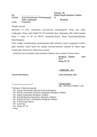 Proposal Permohonan Bantuan Pembangunan Talud Jalan Desa Proposal Bantuan Dana Infrastruktur. Deni Sadikin. Contoh Proposal Pengaspalan Jalan RT. Sindhu Kurnia. Proposal Drainase Bulakparen. Proposal Bantuan Peningkatan Jalan Desa. Burhan Smart. Proposal Padat Karya Desa Bojongmanggu.