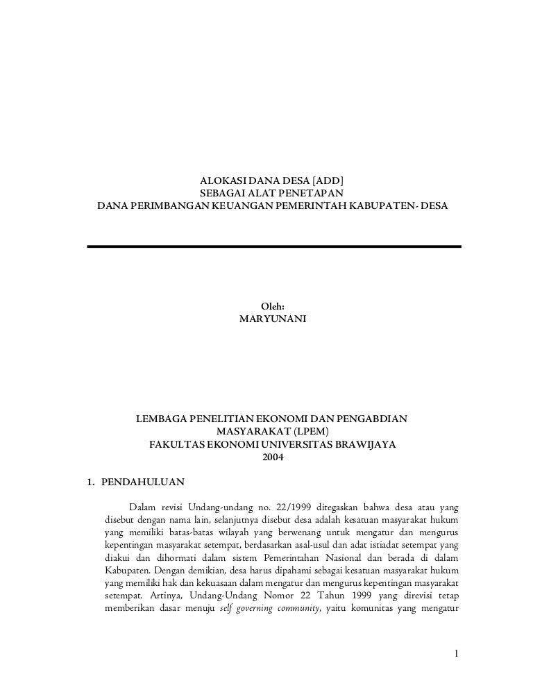 23 Makalah Dana Alokasi Khusus - Info Dana Tunai 23 Makalah Dana Alokasi Khusus. Ditulis Anonim Rabu, 13 April 2016 Tulis Komentar. Edit. Maksud pemberian alokasi dana desa add adalah sebagai bantuan stimulan atau dana perangsang untuk mendorong dalam membiayai program pemerintah desa yang ditunjang dengan partisipasi swadaya gotong royong masyarakat dalam melaksanakan kegiatan pemerintahan dan. MAKALAH ALOKASI DANA DESA.pdf - Books - Non-fiction Share MAKALAH ALOKASI DANA DESA.pdf. Embed size(px) Link. Share. of 11. Report. 8 Categories. Books - Non-fiction Published. Dec 16, 2018. Download. This site is like the Google for academics, science, and research. It strips results to show pages such as .edu or .org and includes more than 1 billion publications, such as web pages, books ... PDF BAB I PENDAHULUAN A. Latar Belakang Masalah - UMS kasus korupsi Alokasi Dana Desa dan tanah bengkok (Kompas.com). TLK diduga telah melakukan korupsi uang ADD dan kas desa sebesar Rp. 118,9 juta. SM diduga melakukan korupsi pada tahun 2014, dan WDD disangka korupsi Rp. 66,81 juta. Kasus lain, yaitu yang terjadi di Kepala Sebatang, Labuhan Batu Utara, Sumatera Utara. ... PDF BAB I PENDAHULUAN 1.1 Latar Belakang - Universitas Diponegoro Tujuan di dalam pembuatan makalah ini adalah 1. Untuk mendeskripsikan dan mengetahui pengelolaan Alokasi Dana Desa (ADD) dalam Pemberdayaan Masyarakat Desa Karangluhur Kabupaten Wonosobo. 2. Untuk mendeskripsikan dan mengetahui faktor pendorong dan faktor penghambat dari pengelolaan Alokasi Dana Desa (ADD) dalam