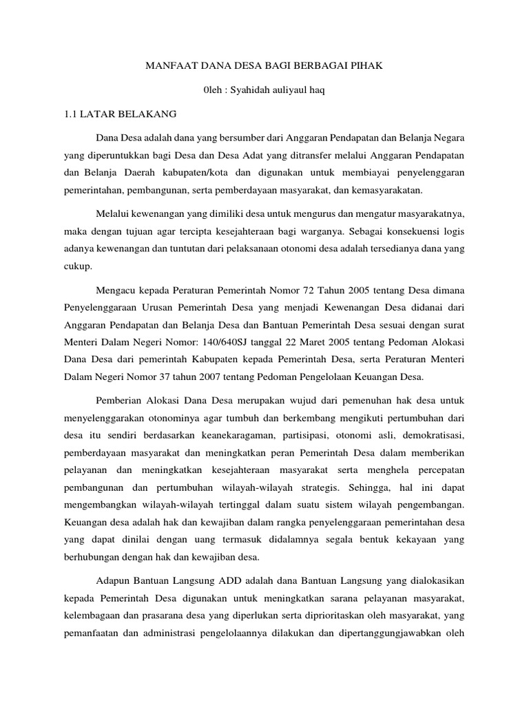 Makalah: Program Dana Desa Untuk Pembangunan Masyarakat Di ... Pemberdayaan masyarakat dan peningkatan kinerja pemerintahan Desa dalam penyelenggaraan pemerintah, pembangunan dan pelayanaan dasar. Dengan adanya Program dana desa yang paling sedikit 10% dari hasil pajak daerah dan retribusi daerah kabupaten/kota alokasi dana desa yaitu sebesar 10% dari dana perimbangan yang di terima kabupaten/kota. Untuk mewujudkan sistem pemerintahan yang sinergis antara ... Mengkaji Permasalahan Alokasi Dana Desa Mengkaji Permasalahan Alokasi Dana Desa. SEMARANG - Perguliran dana desa dari tahun ke tahun semakin meningkat secara pesat. Data di Provinsi Jawa Tengah menunjukkan bahwa total dana desa tahun 2018 sebesar Rp 6,74 trilyun dari tahun sebelumnya Rp 6,3 trilyun, dengan rata-rata penerimaan per desa Rp 863 juta.