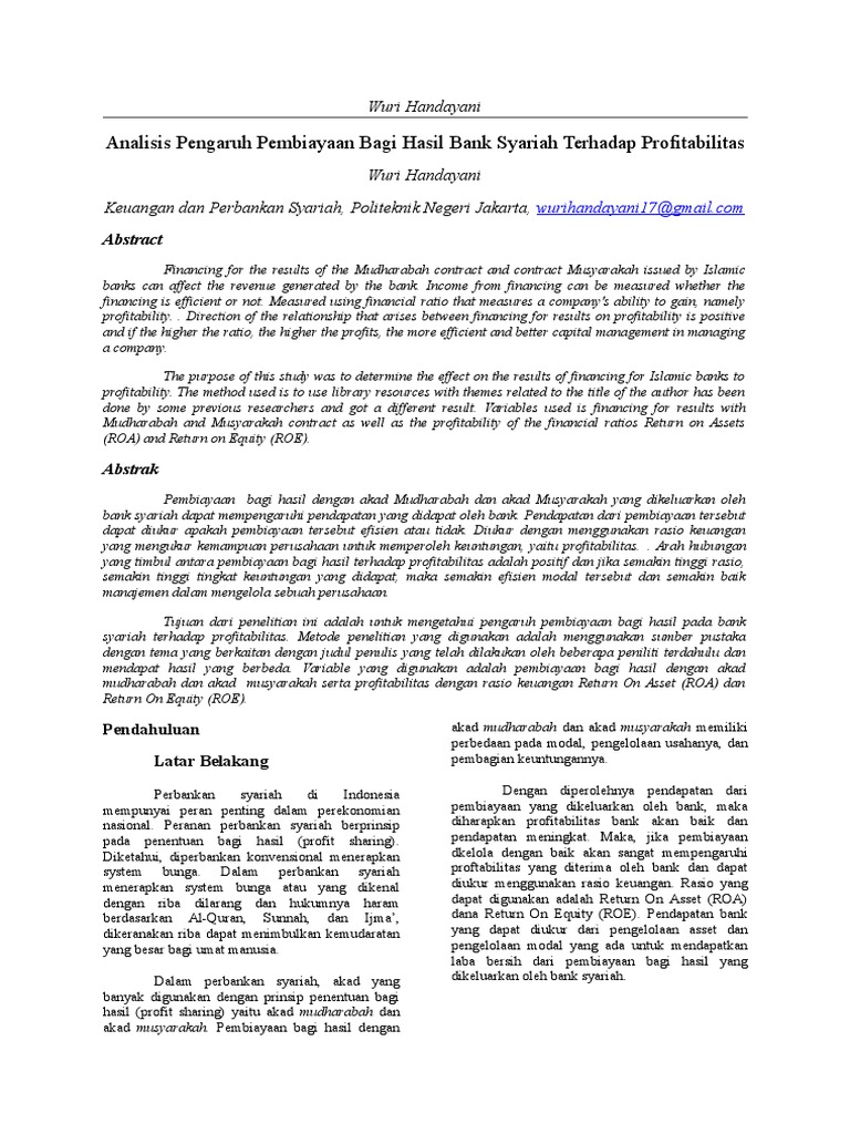 Jurnal profitabilitas bank syariah pdf. Pengaruh inflasi, BI rate dan kurs terhadap... An-Nisbah: Jurnal Ekonomi Syariah is a scientific journal contains original works from lecturers, researchers, students and other concerned parties who Abstract. This study aims to determine the effect of the infation rate, interest rate (BI rate) and the rate of proftability of Islamic banks in Indonesia. (PDF) Profitabilitas Bank Umum Syariah | Zee d'Rockerz ... 3. Bagaimana pengaruh likuiditas terhadap profitabilitas Bank Umum Syariah? (Studi Kasus Pada Bank Umum Dengan Total Asset Kurang Dari 1 Triliun), Jurnal Bisnis Strategi, Vol. 14, 2005, h. 83-9 67 4.3.2 Pengaruh Variabel Kualitas Aset Terhadap Profitabilitas Berdasarkan analisa yang telah... PDF Pengaruh NPF Terhadap Car Serta Dampaknya Terhadap syariah di Indonesia yang terdiri dari Bank Umum Syariah (BUS), Unit Usaha Syariah (UUS) dan Bank Perkreditan Rakyat Syariah (BPRS) Untuk mencapai profitabilitas yang optimal, bank dihadapkan dengan berbagai risiko, salah satunya adalah risiko pembiayaan.Risiko pembiayaan... PDF JURNAL.docx | Profitabilitas Bank Pangsa pembiayaan dan karakteristik bank terhadap profitabilitas bank syariah. (Studi pada Bank Syariah Periode 2006-2010).
