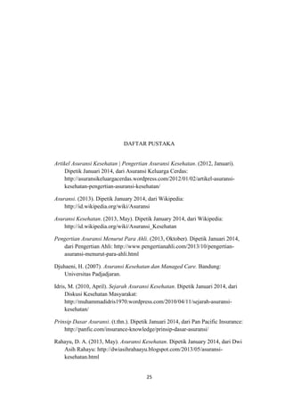 Pengertian asuransi kesehatan pdf. PDF Ansuransi Kesehatan dan Managed Care - WordPress.com I. Prinsip dan Elemen Asuransi Kesehatan 1.1 Definisi Asuransi Kesehatan Health Insurance : The payment for the excepted costs of a group resulting from medical utilization based on the excepted expense incurred by the group. The payment can be based on community or experience rating (Jacobs P, 1997). PDF BUKU PEGANGAN SOSIALISASI - Jaminan Kesehatan Nasional 1. Pengertian Asuransi Kesehatan Sosial (Jaminan Kesehatan Nasional-JKN) Sebelum membahas pengertian asuransi kesehatan sosial, beberapa pengertian yang patut diketahui terkait dengan asuransi tersebut adalah: • Asuransi sosial merupakan mekanisme pengumpulan iuran yang bersifat wajib dari peserta, guna memberikan perlindungan kepada PDF BAB I PENDAHULUAN A. Latar Belakang - DINUS Sejarah perkembangan Asuransi kesehatan di Indonesia sudah dimulai sejak tahun 1934, Pemerintah Hindia Belanda mengatur mekanisme pembiayaan pelayanan kesehatan melalui gaji pegawai pemerintah Hindia Belanda. pada tahun 1968 asuransi kesehatan bagi pegawai negeri dan keluarganya. selain itu banyaknya perusahaan Asuransi yang berdiri di awal ... PDF ASURANSI KESEHATAN (pengantar) - Universitas Diponegoro pengertian asuransi: * asuransi atau pertanggungan adalah perjanjian antara dua pihak atau lebih, dgn mana pihak penanggung mengikatkan diri kepada tertanggung, dgn menerima premi asuransi, utk memberikan penggantian kpd tertanggung krn kerugian, kerusakan, kehilangan keuntungan yg diharapkan, atau tanggung jawab hukum kpd pihak ketiga yg mgkn …
