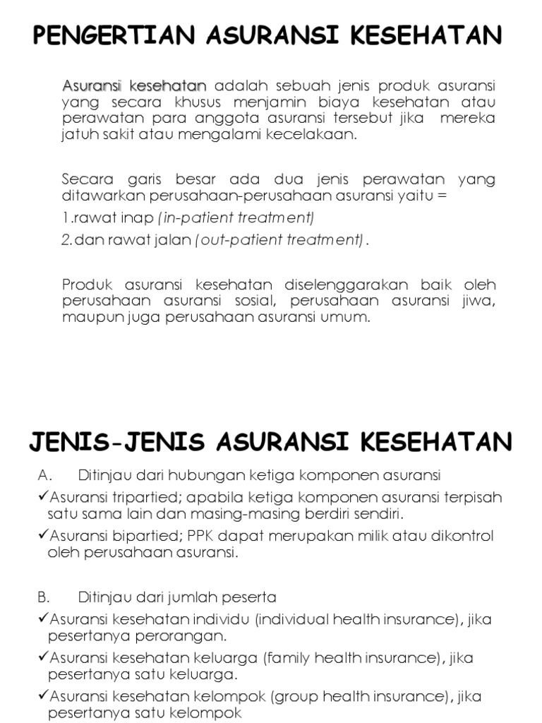 PDF Asuransi Kesehatan Pendahuluan - Dinus Pengertian Asuransi Asuransi kesehatan adalah sebuah jenis produk asuransi yang secara khusus menjamin biaya kesehatan atau perawatan para anggota asuransi tersebut jika mereka jatuh sakit atau mengalami kecelakaan. Secara garis besar ada dua jenis perawatan yang ditawarkan perusahaan-perusahaan asuransi, yaitu rawat inap (in-patient treatment ...