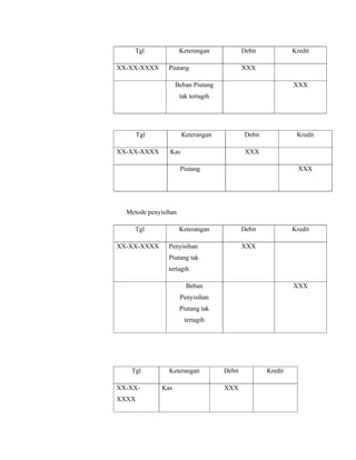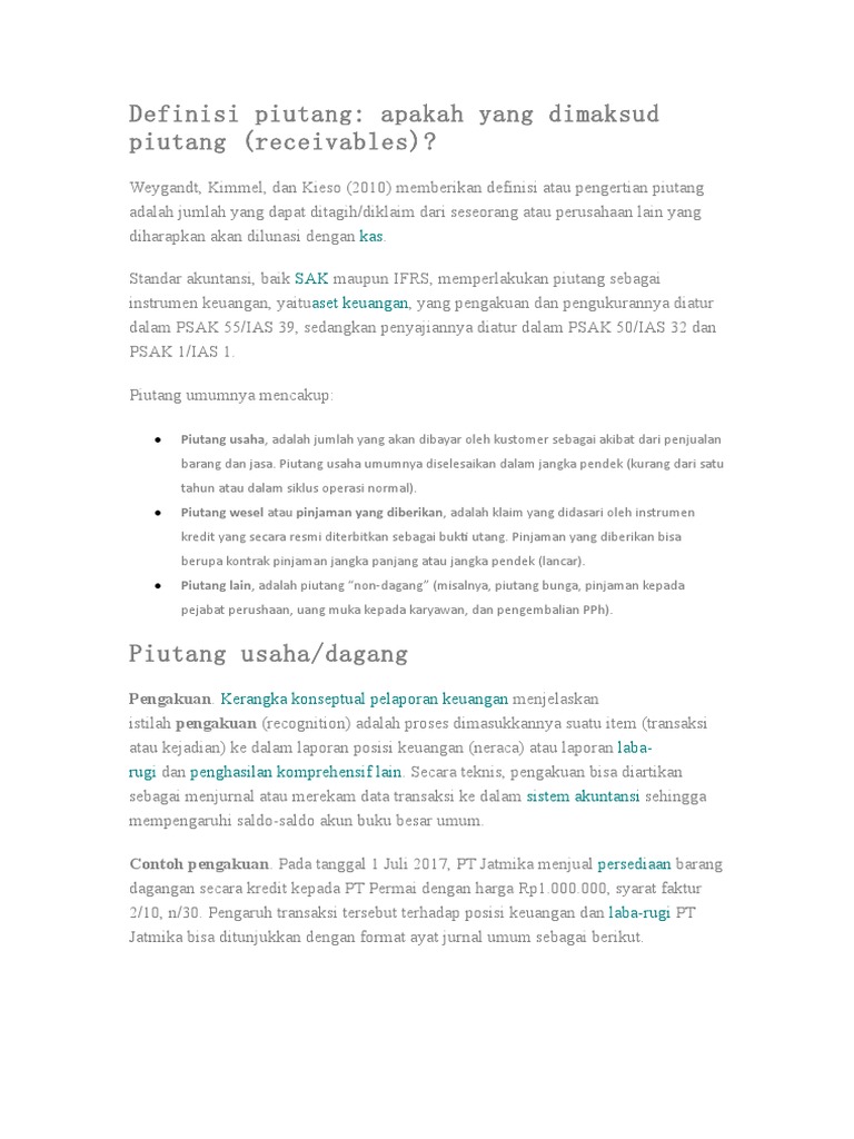 Contoh Laporan Keuangan Perusahaan Jasa Contoh Laporan Keuangan Perusahaan Jasa . Perusahaan Jasa. Perusahaan Jasa (Service Company) merupakan perusahaan yang bergerak dalam bidang penjualan jasa keahlian.Contoh perusahaan jasa seperti kantor akuntan publik, usaha salon, usaha bengkel, bank, asuransi, lembaga pendidikan, sekolah, universitas, klinik dokter, kantor notaris, perusahaan leasing, rumah sakit, usaha rental mobil, jasa ... Penjualan Bersih: Pengertian dan Cara Menghitungnya dalam ... Penjualan Bersih: Pengertian dan Cara Menghitungnya dalam Akuntansi. Penjualan bersih adalah poin yang penting dari laporan keuangan. Angka ini memberikan wawasan penting tentang berapa banyak yang dihasilkan perusahaan atas produk dan layanannya setelah diskon tertentu diperhitungkan. Perbedaan Debit dan Kredit beserta Penerapannya Dalam dunia akuntansi istilah debit maupun kredit sering sekali disebutkan dan menjadi hal pokok dalam menghitung laporan keuangan. Dengan memahami debit dan kredit ini kamu juga bisa mengerjakan pembukuan dengan benar dan tanpa kesalahan saat posting transaksi. Pengelolaan Piutang - Manajemen Keuangan Bila strategi penjualan kredit dilakukan tanpa kendali maka akan berakibat saldo piutang tinggi dan kredit macet. Strategi penjualan kredit akan menimbulkan dampak dalam pengelolaan kas (cash management), operasional, perlakuan akuntansi serta klasifikasi piutang usaha dalam laporan keuangan.