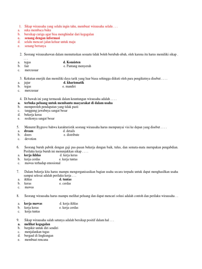 Soal Latihan Kewirausahaan Kelas 10 Beserta ... - PRAKATA Kita Salah satu syarat menjadi wirausahawan yang baik dan sukses adalah….. a. Berpikir luas ... Yang bukan salah satu penyebab gagalnya seorang pelaku bisnis dalam menjalankan ... Factor yang bukan mendukung keberhasilan usaha adalah….. a. prestatif b. ketergantungan