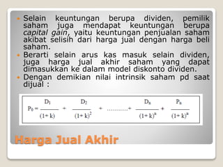 Analisa Penilian Saham - Nilai yang Berkaitan dengan Saham Nilai buku adalah nilai saham menurut pembukuan perusahaan. Nilai pasar adalah harga saham di bursa efek. Nilai intrinsic adalah nilai sebenarnya dari saham. Memahami keempat konsep nilai ini merupakan hal yang perlu dan berguna, karena konsep- konsep itu dapat digunakan untuk mengetahui saham- saham mana yang bertumbuh ( growth) dan mana yang ...
